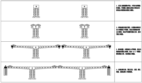 ③錨固系統(tǒng):分為主桁架的錨固和平臺系統(tǒng)的錨固兩部分,主桁架用φ32精扎螺紋鋼筋錨固在箱梁上。平臺系統(tǒng)前端通過精軋螺紋吊桿和吊帶錨固在前上橫梁上。