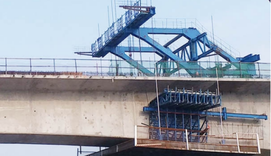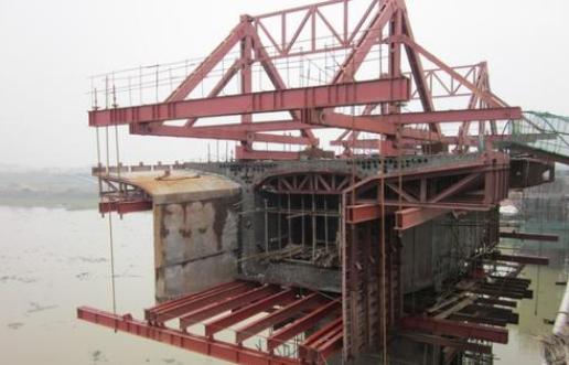 掛籃是滑動或滾動的承重構(gòu)架,錨固在橋梁上,含有行走軌道。在掛籃上可進(jìn)行模板、鋼筋、預(yù)應(yīng)力管道的施工,混凝土灌注和預(yù)應(yīng)力張拉,壓漿等作業(yè)。完成一個節(jié)段的循環(huán)后,掛籃即可前移并再次固定,進(jìn)行下一階段的懸澆。一直到主跨完成并且合攏;