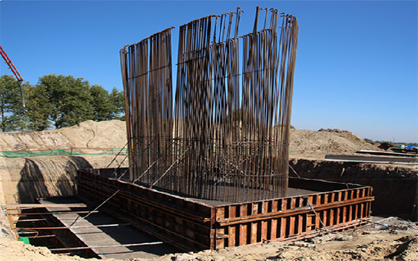 4、先進行平面模板的調(diào)裝,然后進行圓弧模板的調(diào)裝,就位后模板外側(cè)用斜撐進行加固,調(diào)整后與墩身模板進行連接固定然后對左右側(cè)模板進行吊裝。
